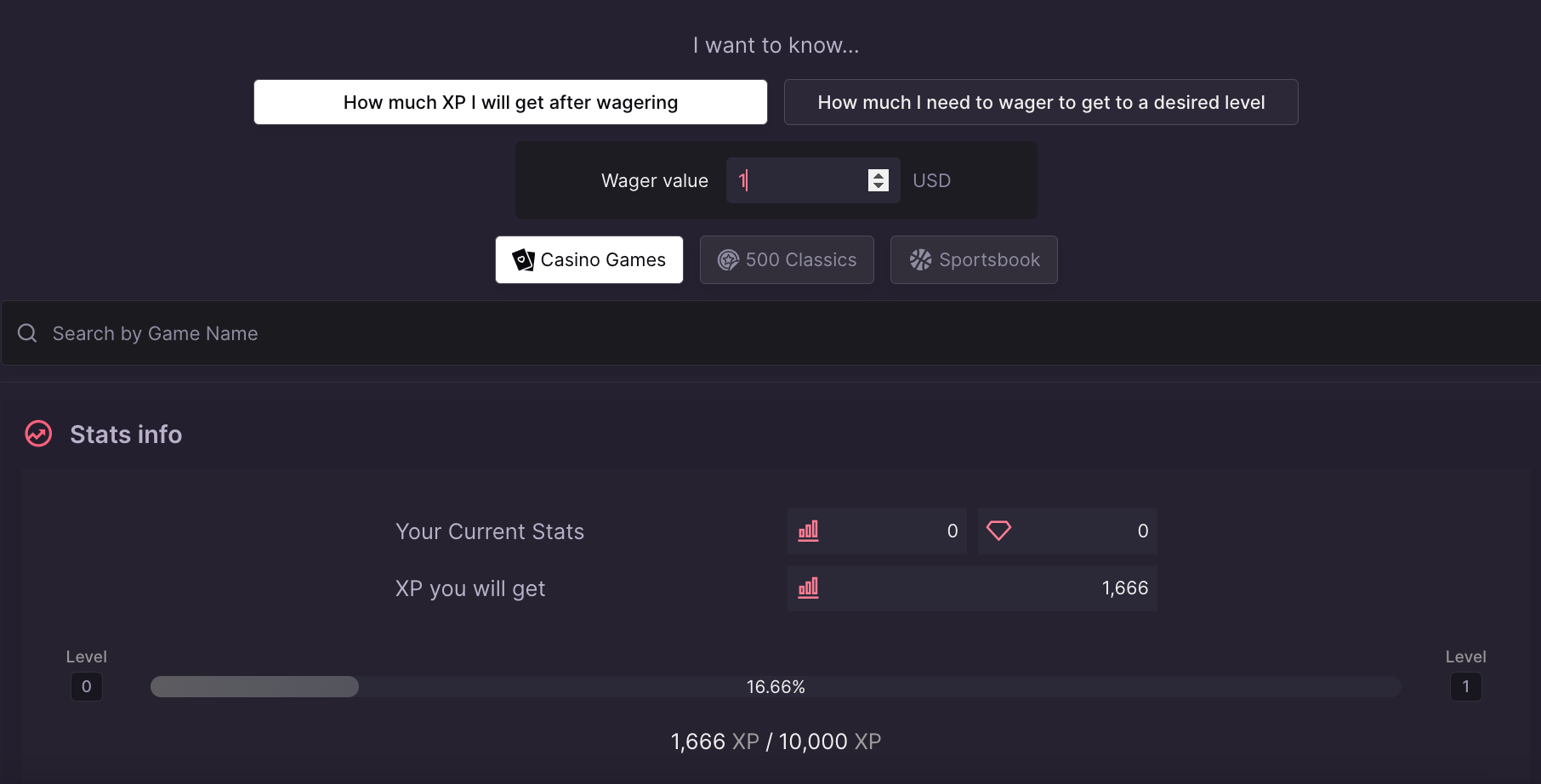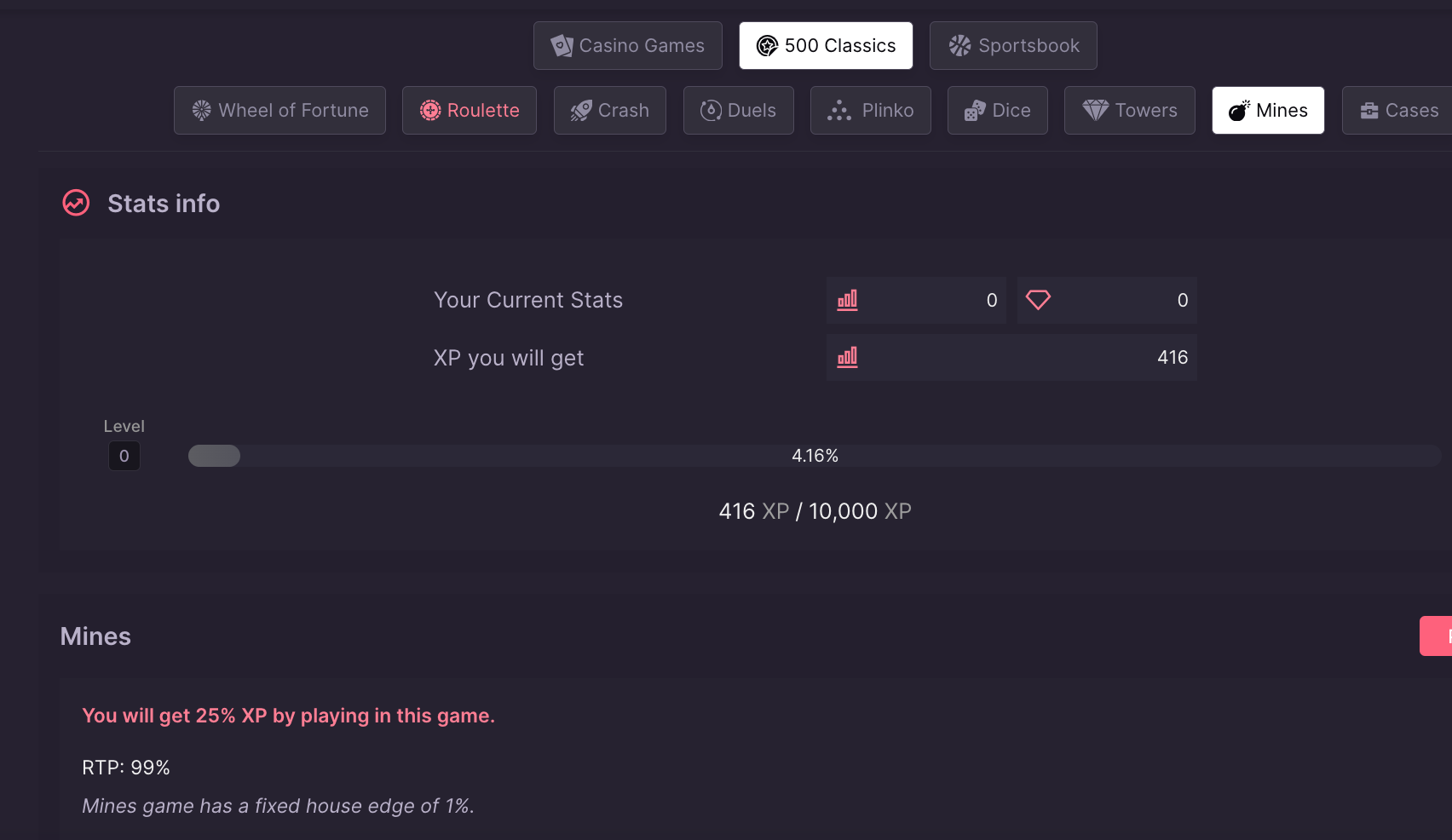 Standard casino games: $1 = 1666 XP, but for example, Crash (RTP ~99%): $1 = 416 XP. This is a smart fix to a classic leaderboard problem.