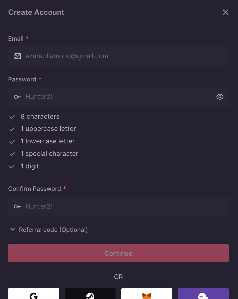 + Google, Email, Steam, MetaMask, and Phantom.