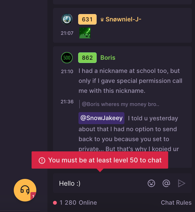 + Chat unlocks at Level 50 (~$750 of wager)