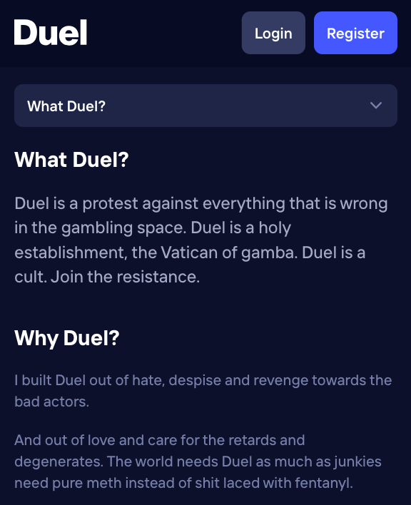 Duel .com feels like a casino built for insiders, not for the masses. Their slogan says it all: โThe First Casino That Gives a Fuckโ