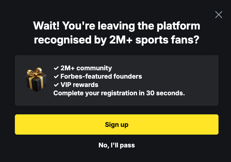 I guess, a quiet chat room would make low activity visible, which could conflict with their trust-building message: “Trusted by 2M+ sports fans.” - Aggressive onboarding and exit-intent capture