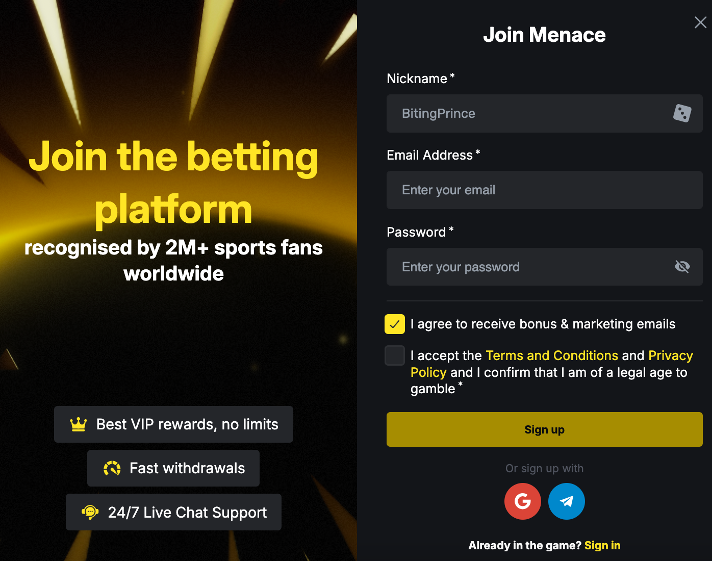 + Sign-up options: Google, Email, and Telegram.