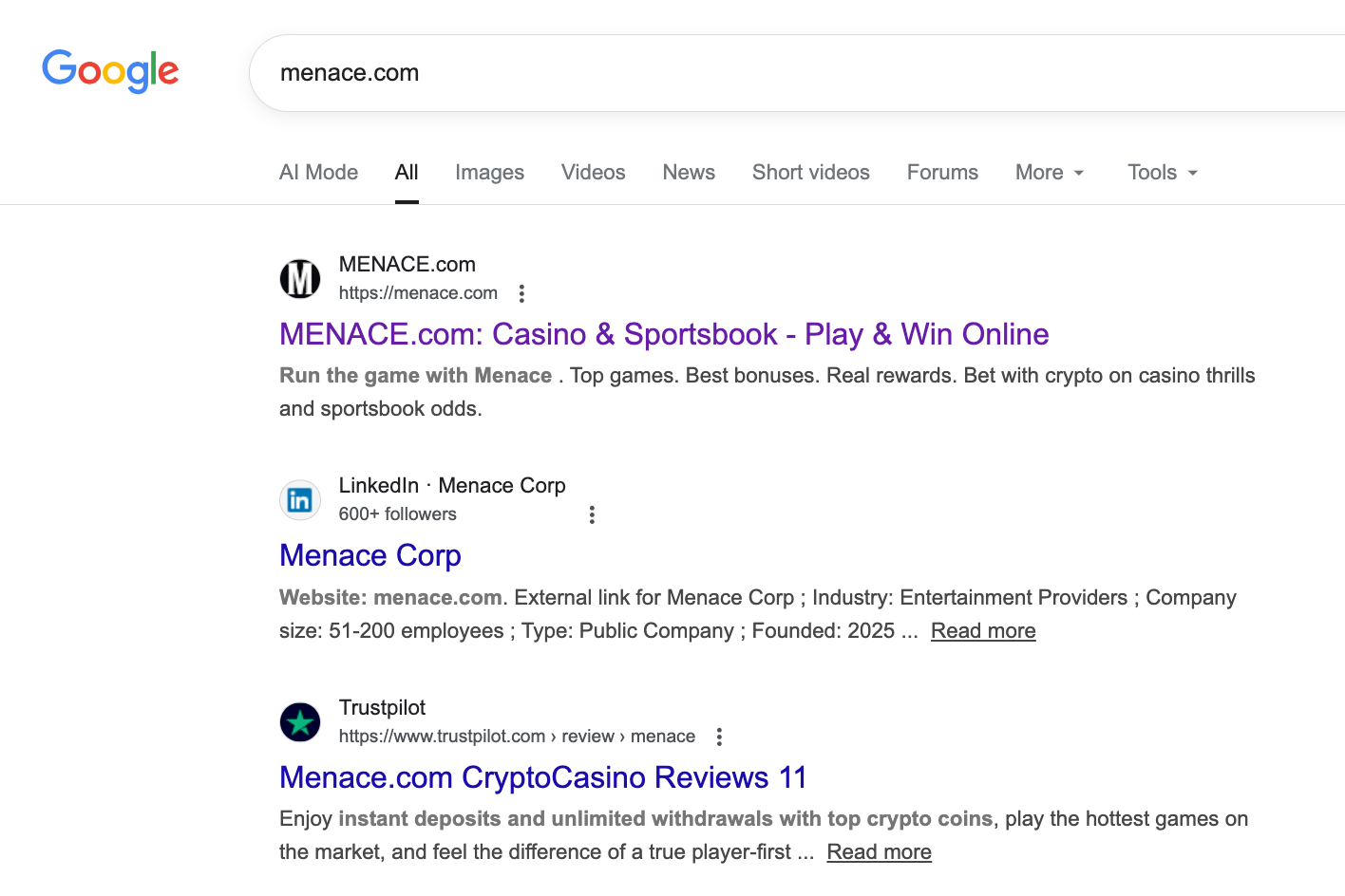 Menace is a relatively new online casino, launched around August 2025.