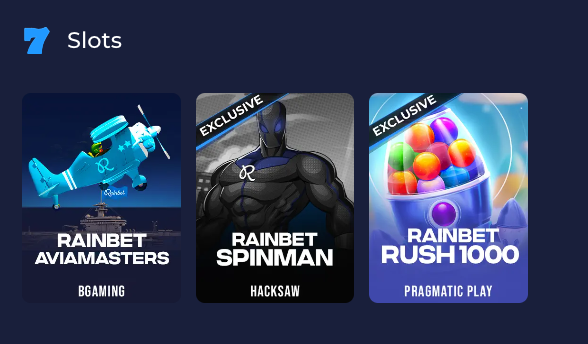 + Exclusive games: Rainbet Aviamaster (Bgaming), Rainbet Rush100 (Pragmatic), Rainbet Spinman (Hacksaw).