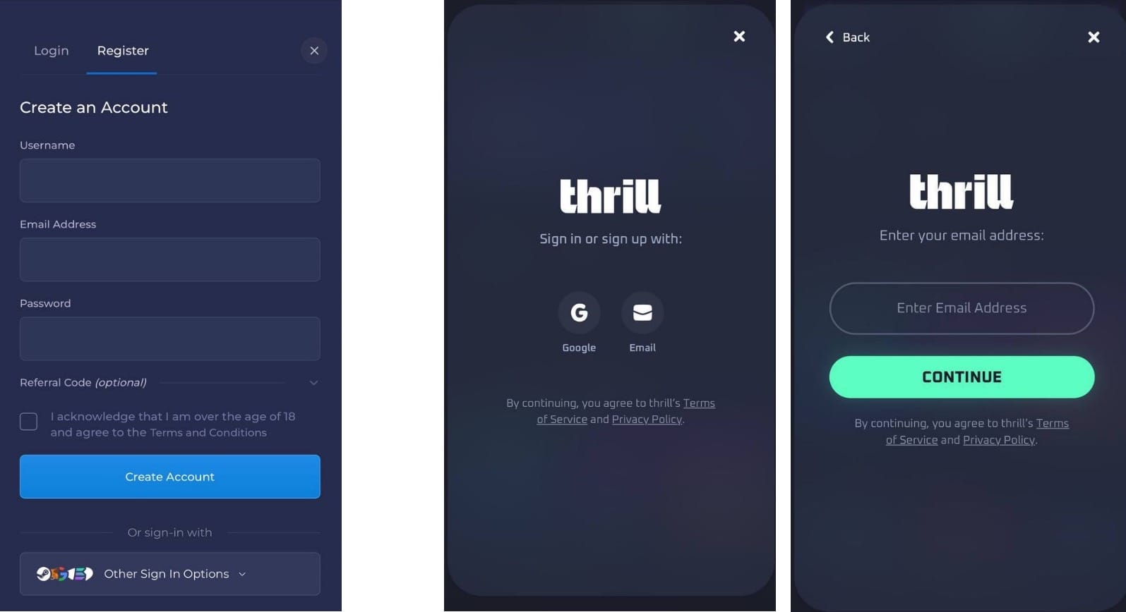 + Thrill: starts with a branded welcome screen and just two login options (Google / Email). → Classic mobile-app pattern: choose the method first, enter details second.