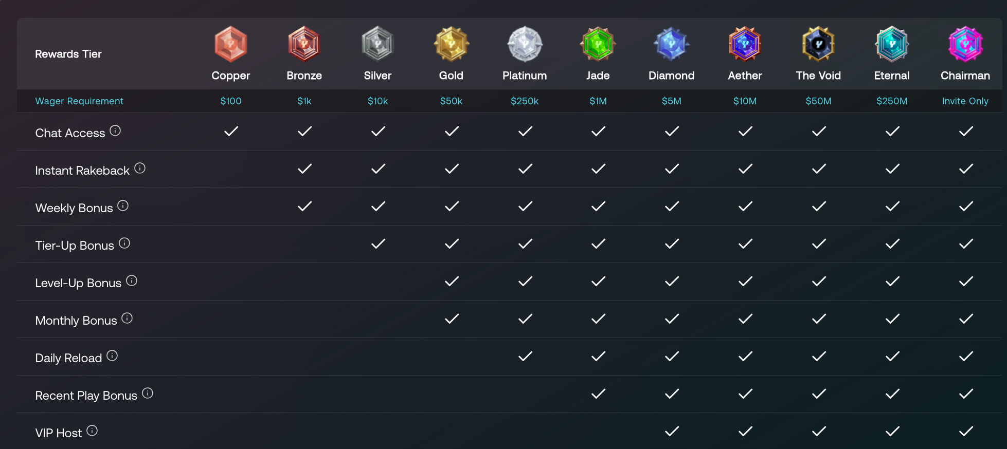 - Based on VIP program: VIP user can get a VIP host only when wagers $5m. If house edge is 3%, then $5m * 0.03 = $150k in losses before personal attention. I mean, I would contact user if his losses are already $50k or I see that user's average deposit is very high. Just a thought.